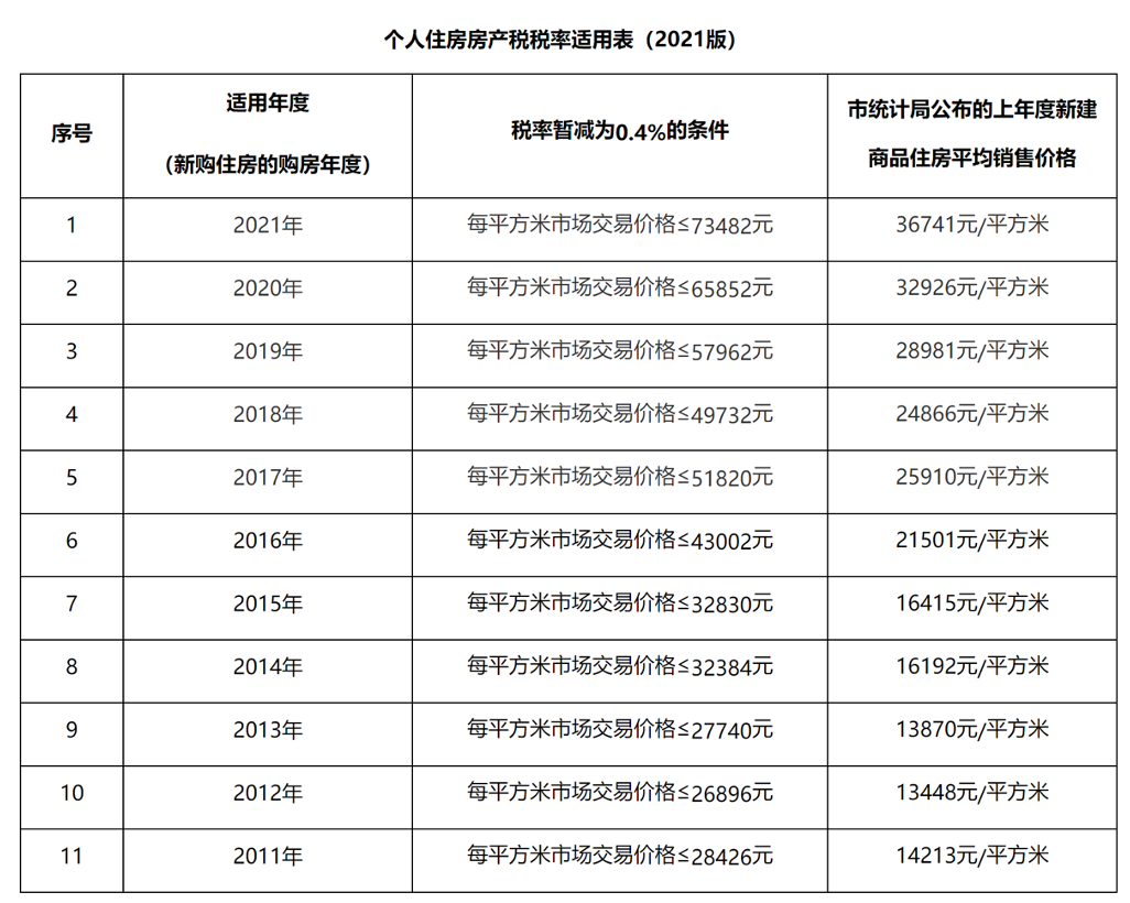 具體而言,2021年上海市統(tǒng)計局公布的上年度新建商品住房平均銷售價格為36741元/平方米,按此計算,2021年新購入住房的相關(guān)購房者,如果每平方米市場交易價格≤73482元的,稅率可暫減為0.4%,否則按照0.6%計算。